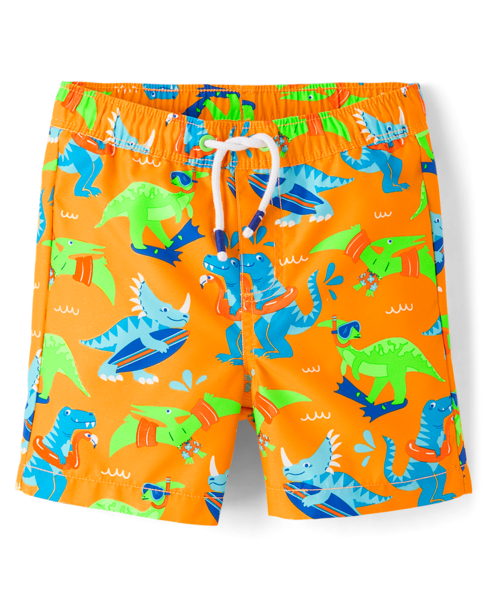This boys dino print swim trunks and matching rash guard from Gymboree has plenty of attitude, making it a favorite for any little boy: